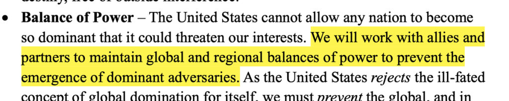 This is most clearly seen in the section on the Western Hemisphere: “Trump Corollary to the Monroe Doctrine” and the formula for preventing “non-Hemispheric competitors” from gaining strategic assets/control in the region – a signal of American primacy in “its own backyard”.