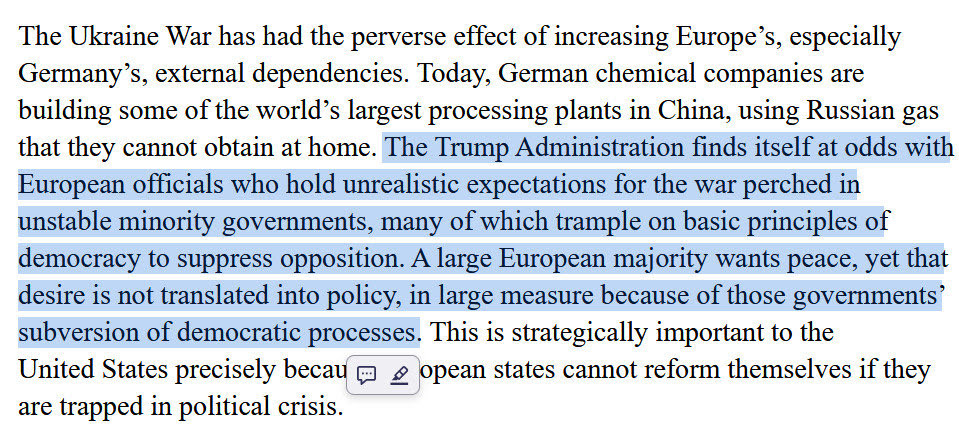 We had a pretty vacuous meltdown over Vance‘s cultural war stuff in the Munich Security Conference speech this past February. That is now all over the NSS as well. On steroids.